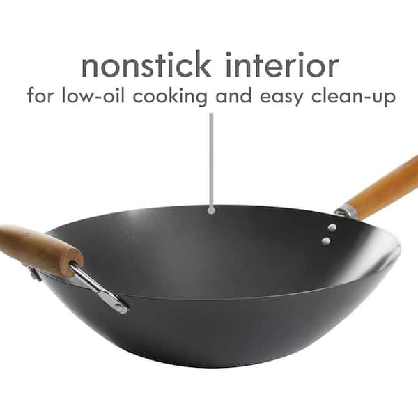 14 in. Black Heavy-Gauge Carbon Steel for Any Type of Cooktop Flat Bottom Wok with Wood Handle that Resist Heat