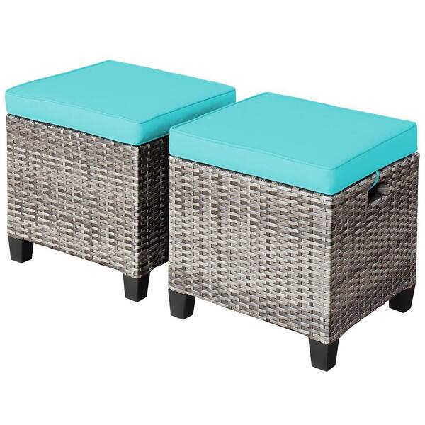 15.5 in. D x 19.5 in. W x 13"H Mix Grey Rattan Wicker Outdoor Ottoman with Removable Turquoise Cushion (2-Pack)