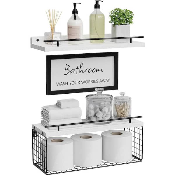 15.7 in. W x 6 in. D x 5.5 in. H White Wood Decorative Wall Shelf with Bathroom Wall Decor Sign, Set of 3