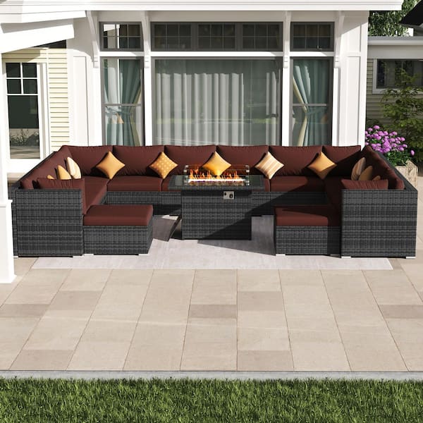 15-Piece Outdoor PE Wicker Patio Furniture Deep Seating Conversation Set with Fire Pit Table, Red Cushion, Ottoman