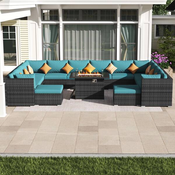 15-Piece Outdoor PE Wicker Patio Furniture Deep Seating Conversation Set with Fire Pit Table, Teal Cushion, Ottoman
