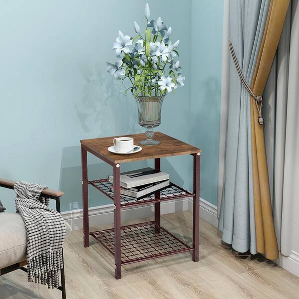 16.14 in. 3 Tier Rustic Brown Square Wood Top End Table Side Table with Storage Shelves