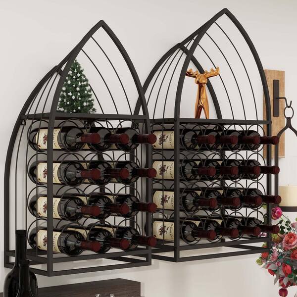 16-Bottle Black Sailboat-Shaped Wood-Metal Wall Mounted Wine Rack Set of 2, Wall Bar Shelf Wine Display Storage Holder