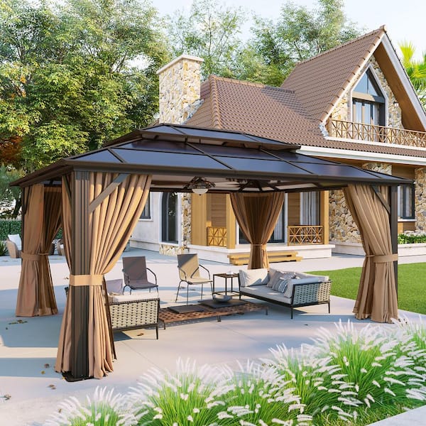 16 ft. x 12 ft. Outdoor Brown Polycarbonate Gazebo with Double Roof, Curtains, and Netting for Backyard