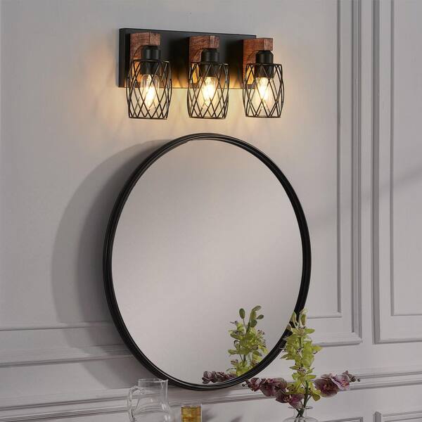 17.5 in. 3-Light Industrial Brown Vanity Light with Wooden Accents for Bathroom