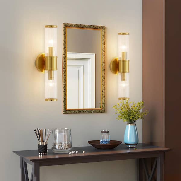 17.7 in. 2-Light Gold Wall Sconce with Cylinder Glass Shade Modern Bathroom Light Fixture