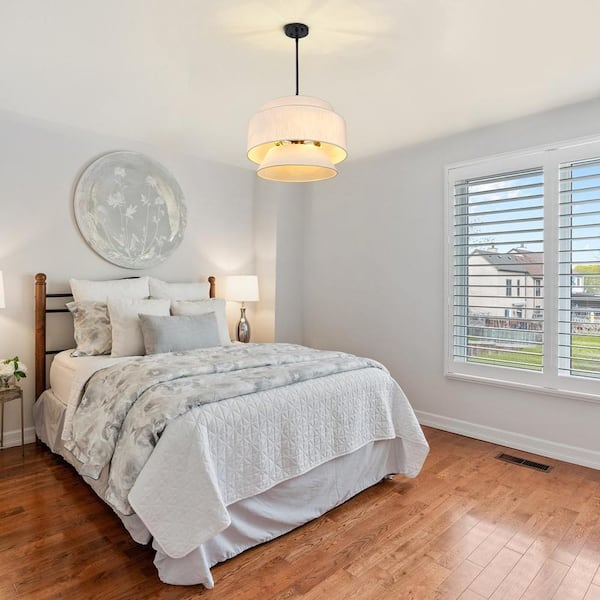 • Modern white fabric shade adds sophistication to your space