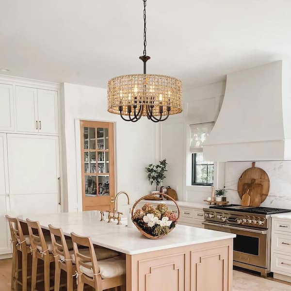 17.7 in. 6-Light Black Rattan Boho Chandelier with Wicker Shade for Kitchen Island Dining Room Hallway