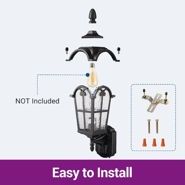 17.83 in. Black with Gold Edge Motion Sensing Dusk to Dawn Outdoor Hardwired Wall Lantern Scone with Water Ripple Glass