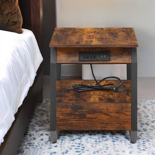 17.91 in. Rustic Brown Rectangle Wood Top End table Side table with Charging Station