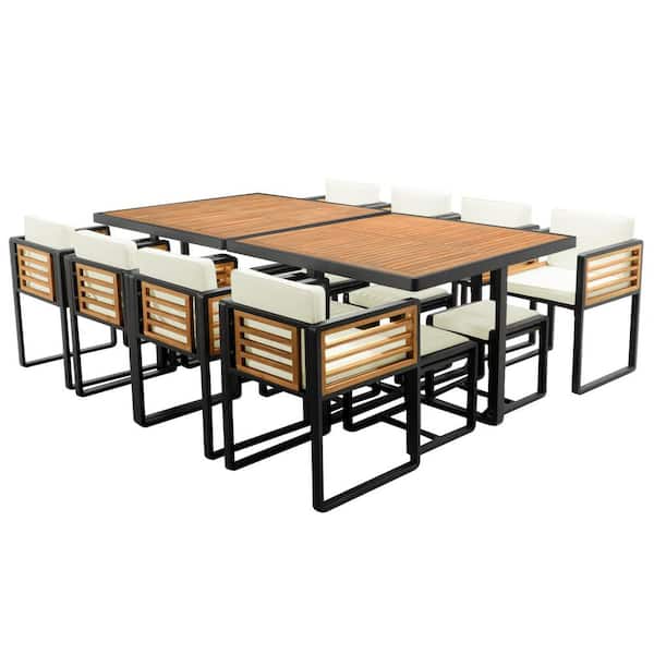18-Piece Acacia Wood Outdoor Dining Set Garden Patio Set with Beige Cushions for Backyard, Deck, Poolside