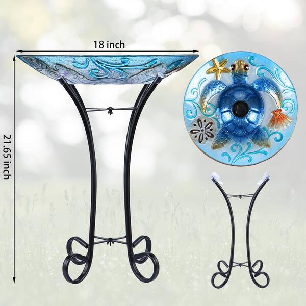 18 in. Glass Birdbath Green Turtle Outdoor Fusion Solar with Stand