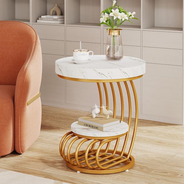 19.7 in. White Round Wood and Metal C-Shape End Table, 2-Tier Modern Side Table with Shelf Storage and Faux Marble Top