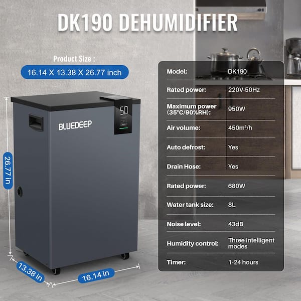 190 pt. 8,000 sq. ft. Dehumidifier in Black with 2.11 Gal. Water Reservoir, for Residential or Commercial Spaces
