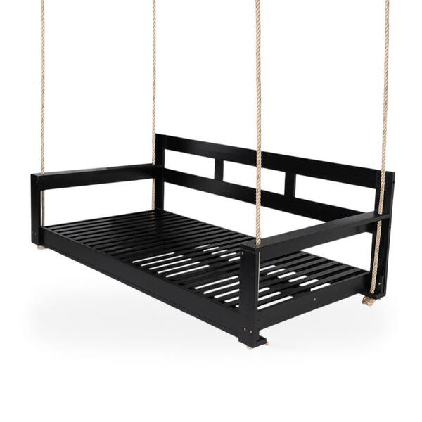 2 Person Black Acacia Wood Porch Swing, Garden Swing Bench Chair with 4 Hanging Ropes for Backyard