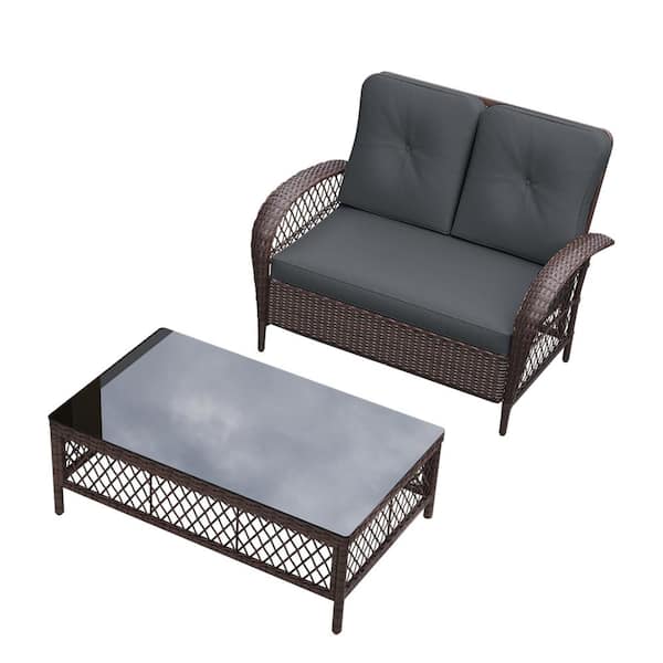 2-Person Brown Wicker Patio Conversation Seating Set with Dark Gray Cushions and Coffee Table