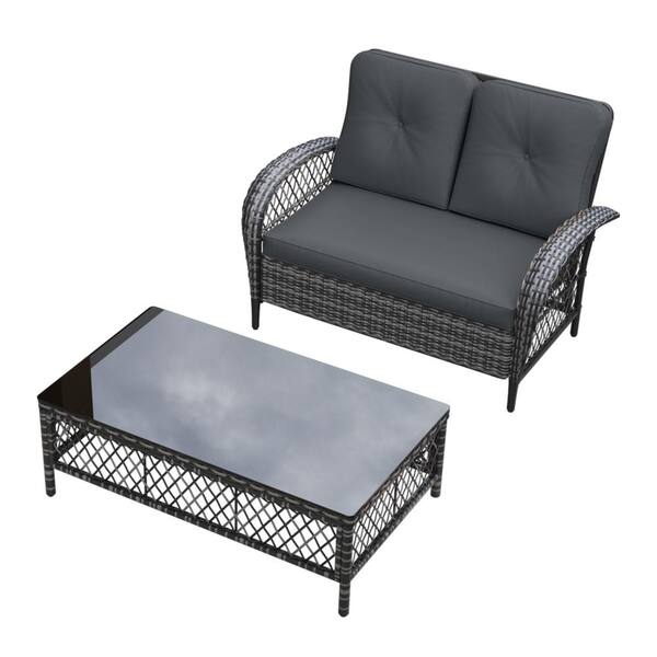2-Person Gray Wicker Patio Conversation Seating Set with Dark Gray Cushions and Coffee Table