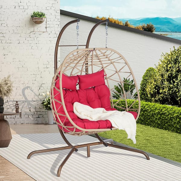 2-Person Light Yellow Wicker Patio Swing with Red Cushions, UV Resistant Frame and Water Resistant Cushion