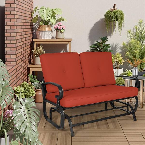 2-Person Metal Outdoor Patio Glider Rocking Bench Loveseat with Red Cushion, Outdoor Rocking Chair for Porch, Patio