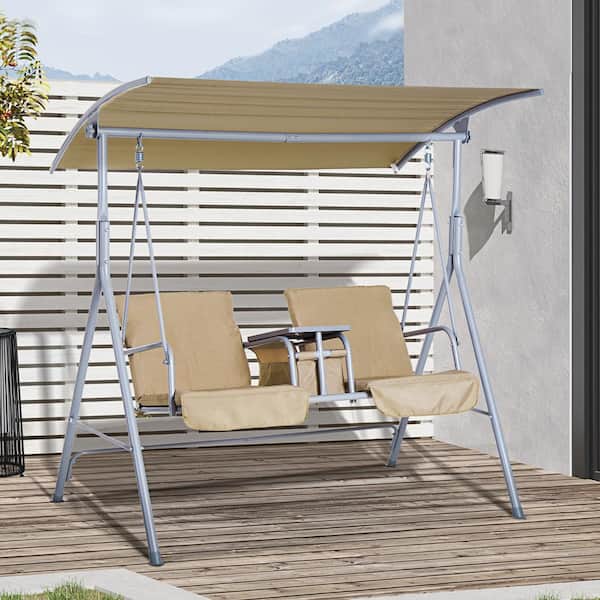 2-Person Metal Porch Swing with Stand with Canopy, Pivot Storage Table, 2 Cup Holders, Cushions for Patio in Beige