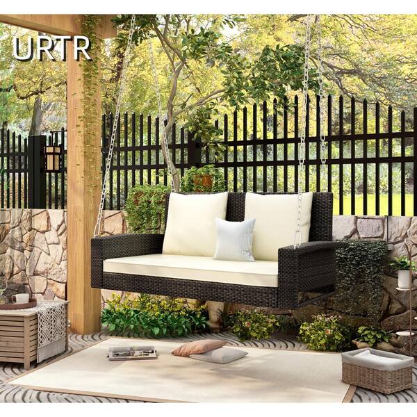 2-Person Outdoor Brown Rattan Swing Chair Bench Patio PE Wicker Hanging Porch Swing with Chains, Beige Cushion, Pillow