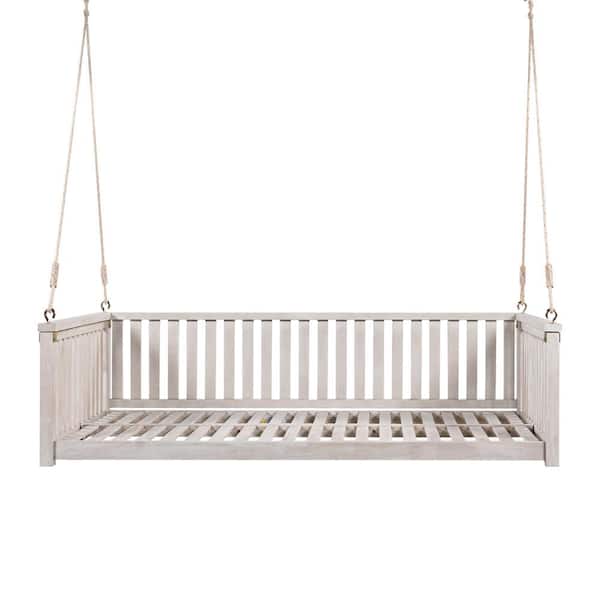 2-Person Outdoor Patio Garden Wood Porch Swing Twin Sized Bed with Ropes for Backyard, Safe Sloped Design, White