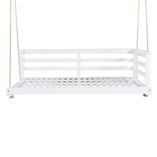2-Person White Wood Porch Swing with 4-Piece 96 in. Hemp Ropes for Backyard