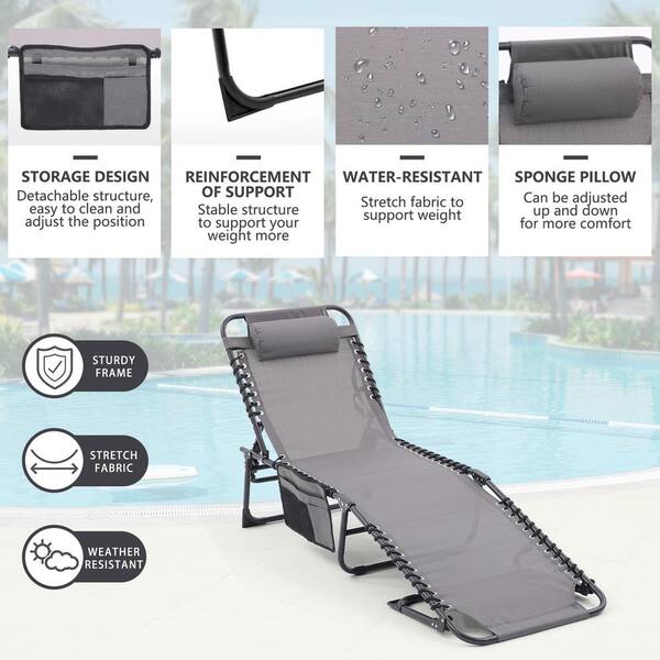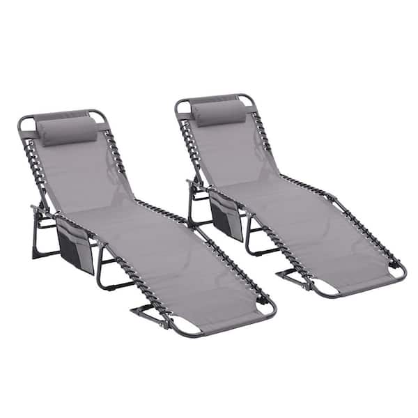 2-Piece Metal Folding Waterproof Outdoor Chaise Lounge with Pillow and Pocket, Dark Grey Seat, Adjustable and Reclining
