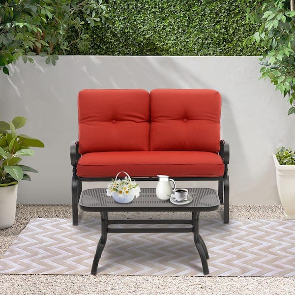 2-Piece Metal Patio Conversation Seating Set with Red Cushions