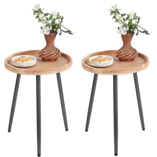 2-Piece Rattan Round Side End Table, Nightstand Tables, Log Desktop, Wooden Tray Table with Black Metal Stand End Table
