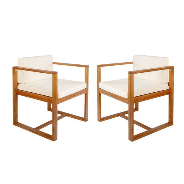 2-Piece Teak Acacia Wood Outdoor Patio Dining Chairs Arms with Beige Cushions for Backyard Garden Porch