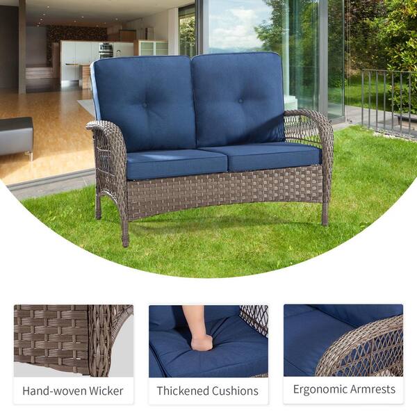 2-Piece Wicker Outdoor Loveseat Conversation Set with Glass Top Coffee Table, Metal Frame with Blue Cushions