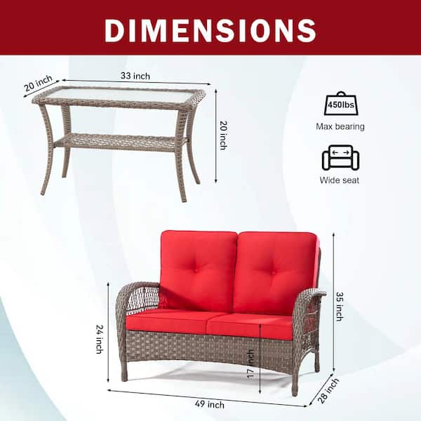 2-Piece Wicker Outdoor Loveseat Conversation Set with Glass Top Table, Metal Frame with Red Cushions