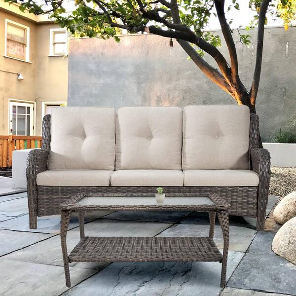 2-Piece Wicker Outdoor Patio Conversation Set with Beige Cushions and Coffee Table, Tempered Glass Tabletop