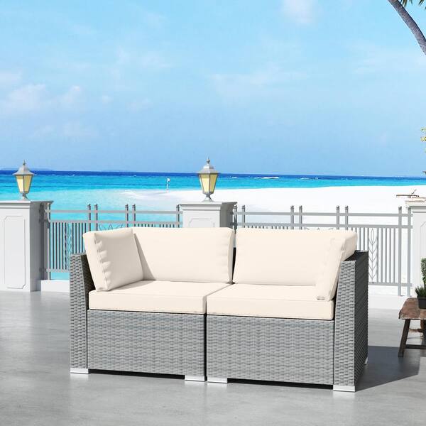 2-Piece Wicker Outdoor Patio Furniture Sectional Conversation Set with Beige Cushion