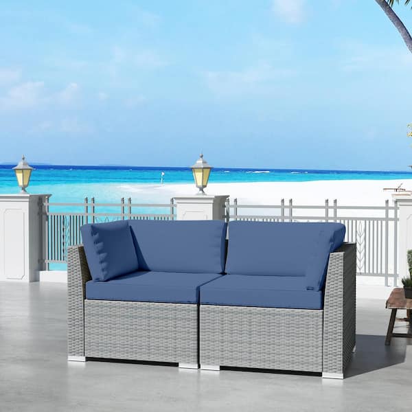 2-Piece Wicker Outdoor Patio Furniture Sectional Conversation Set with Blue Cushion