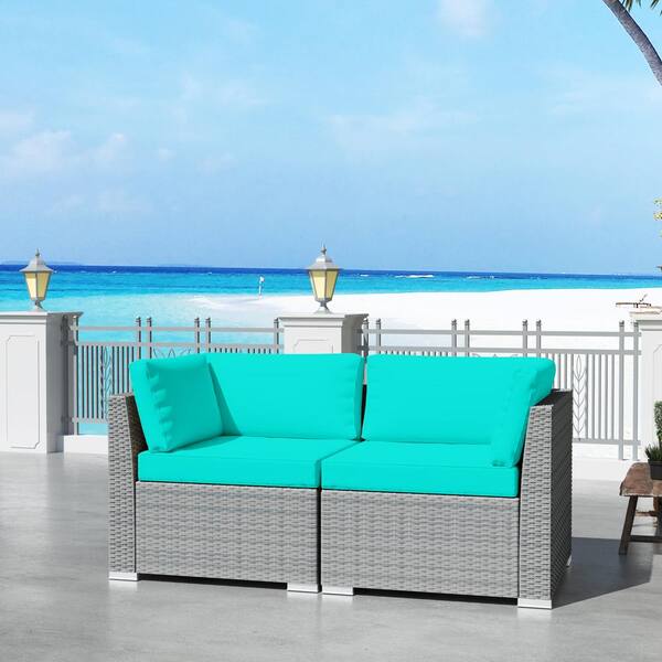 2-Piece Wicker Outdoor Patio Furniture Sectional Conversation Set with Turquoise Blue Cushion