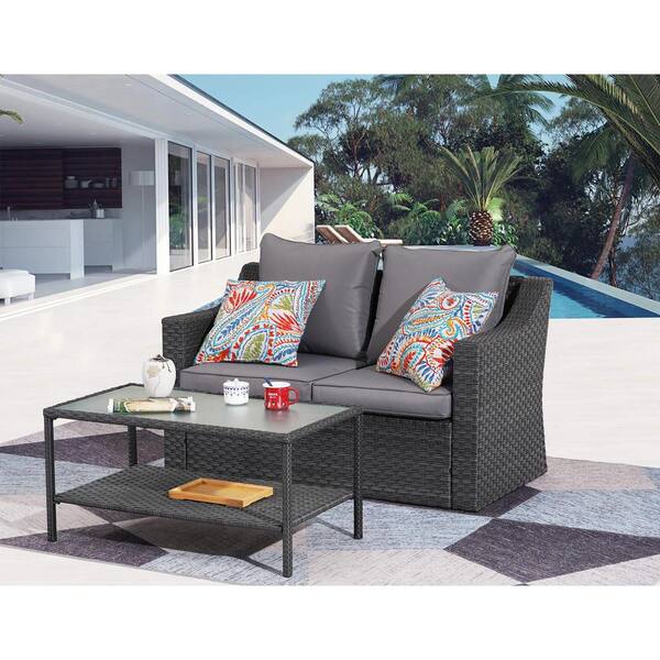 2-Piece Wicker Patio Conversation Set with Gray Cushions, Double Sofa and Coffee Table