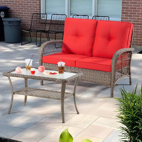 2 Pieces Brown Wicker Patio Conversation Set with Red Olefin Cushions, One Love Seat and One Coffee Table