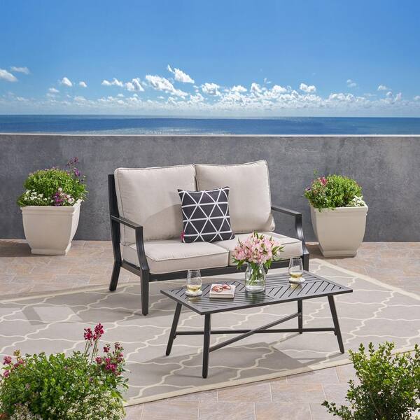 2 Pieces Metal Outdoor Loveseat, with Coffee Table and Light Beige Cushions, for Garden, Deck, Backyard