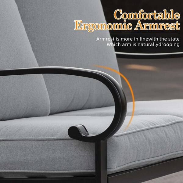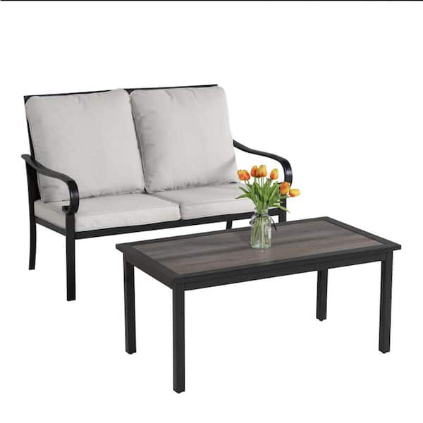 2-Pieces Metal Patio Conversation Seating Set, 1-Love seat and 1-Coffee Table, with Gray Cushions, for Garden