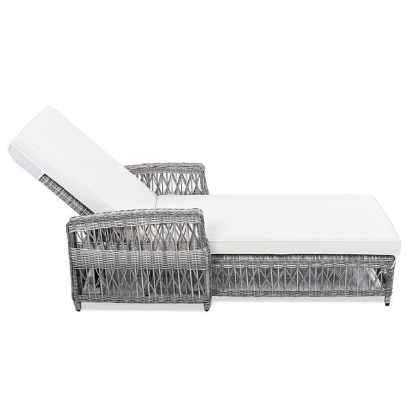 2-Pieces Wicker Outdoor Patio All-Weather Chaise Lounge with Adjustable Backrest and Armrests, Beige Cushions