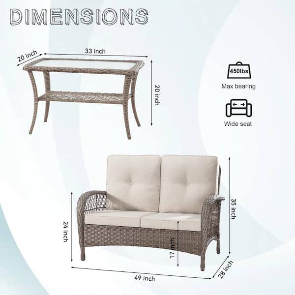 2-Pieces Wicker Patio Conversation Seating Set, 1-Love Seat and 1-Coffee Table, with Beige Cushions, for Garden