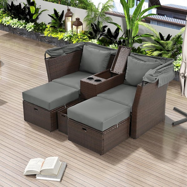 2-Seater Gray Wicker Rattan Outdoor Patio Double Day Bed Outdoor Love seat Sofa Set with Foldable Awning Gray Cushions