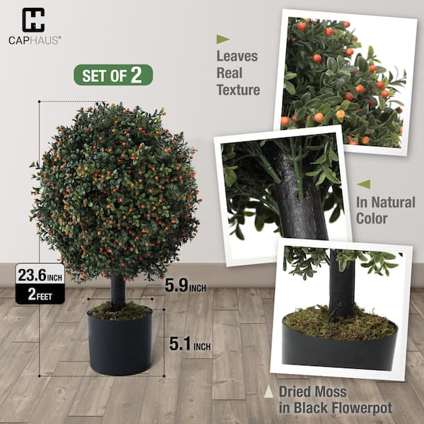 2 ft. Artificial Boxwood Topiary Ball Tree with Orange Flowers Artificial UV Resistant Bushes Plant (Set of 2)