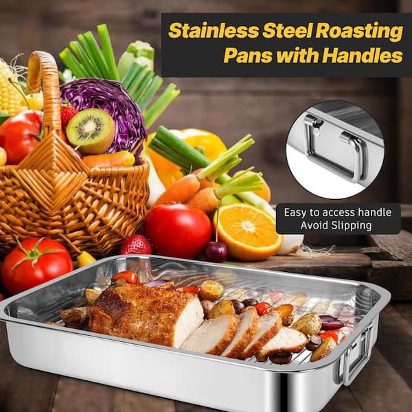 2 pcs Silver Stainless Steel Roasting Pan with Rack Oven Safe Dishwasher Safe Rectangular Bakeware Pan