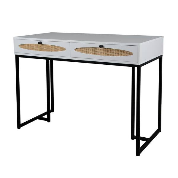 20.08 in. U-shaped White MDF 2 Rattan Drawer Writing Desk with Metal Legs