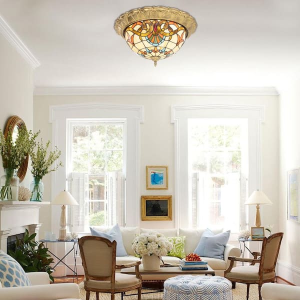 20.47 in. 36-Watt Gold European LED Flush Mount Ceiling Light with Stained Glass Shade