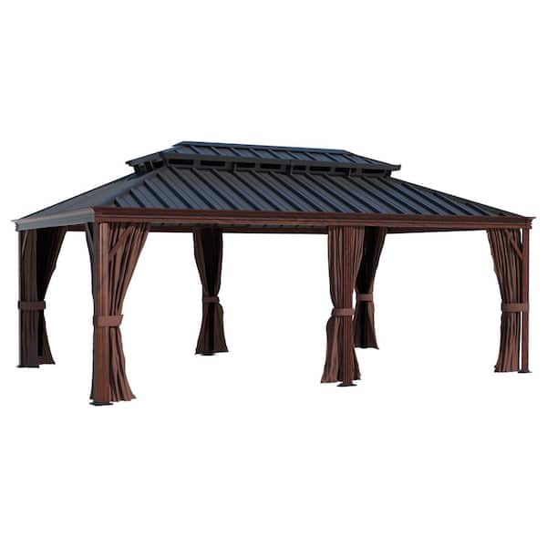 20 ft. x 12 ft. Wood Grain Aluminum Hardtop Gazebo Double Roof with Curtains and Netting