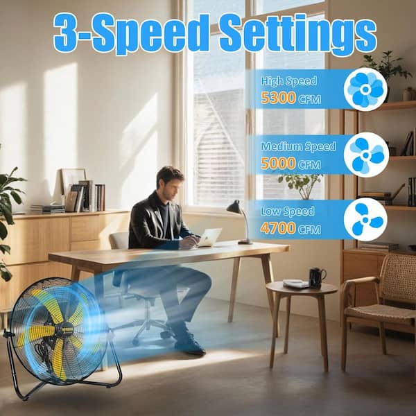 20 in. 5300 CFM High Velocity Metal Floor Fan, 3-Speed Powerful Cooling 360° Adjustable Tilting Head in Yellow